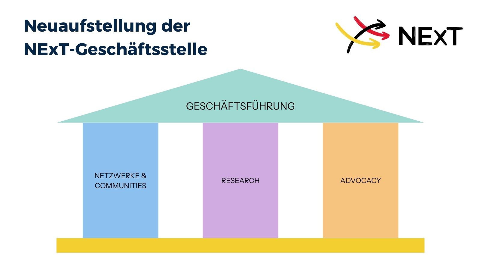 Künftig wird die NExT-Geschäftsstelle aus drei Säulen bestehen, die gemeinsam von Geschäftsführerin Ann Cathrin Riedel, unterstützt von Isabel Drogan (Assistenz der Geschäftsführung & Teamassistenz), koordiniert werden.