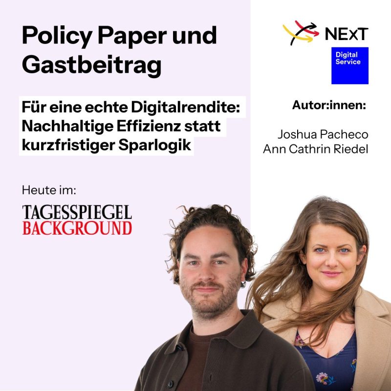 Im Gastbeitrag im Tagesspiegel Background argumentieren Ann Cathrin Riedel (Geschäftsführerin von NExT e.V.) und Joshua Pacheco vom DigitalService des Bundes, dass staatliche Digitalisierung nicht an kurzfristigen Einsparungen gemessen werden darf.